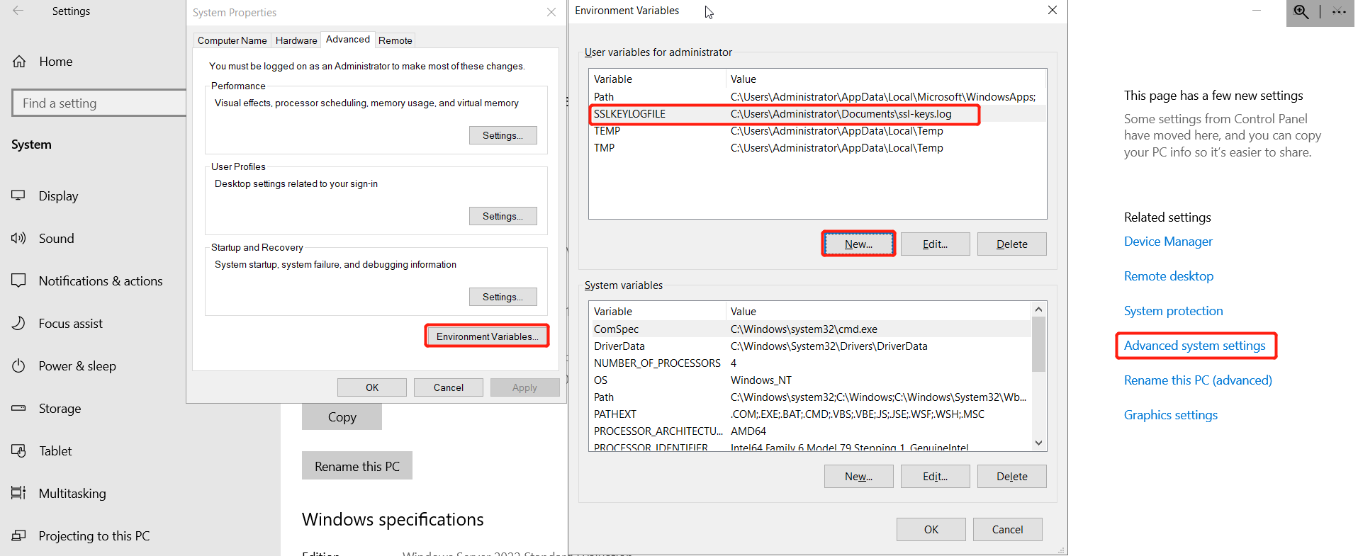 E.g. Create a new environment variable under User variables and select a file named “ssl-keys.log” to store SSL keys.