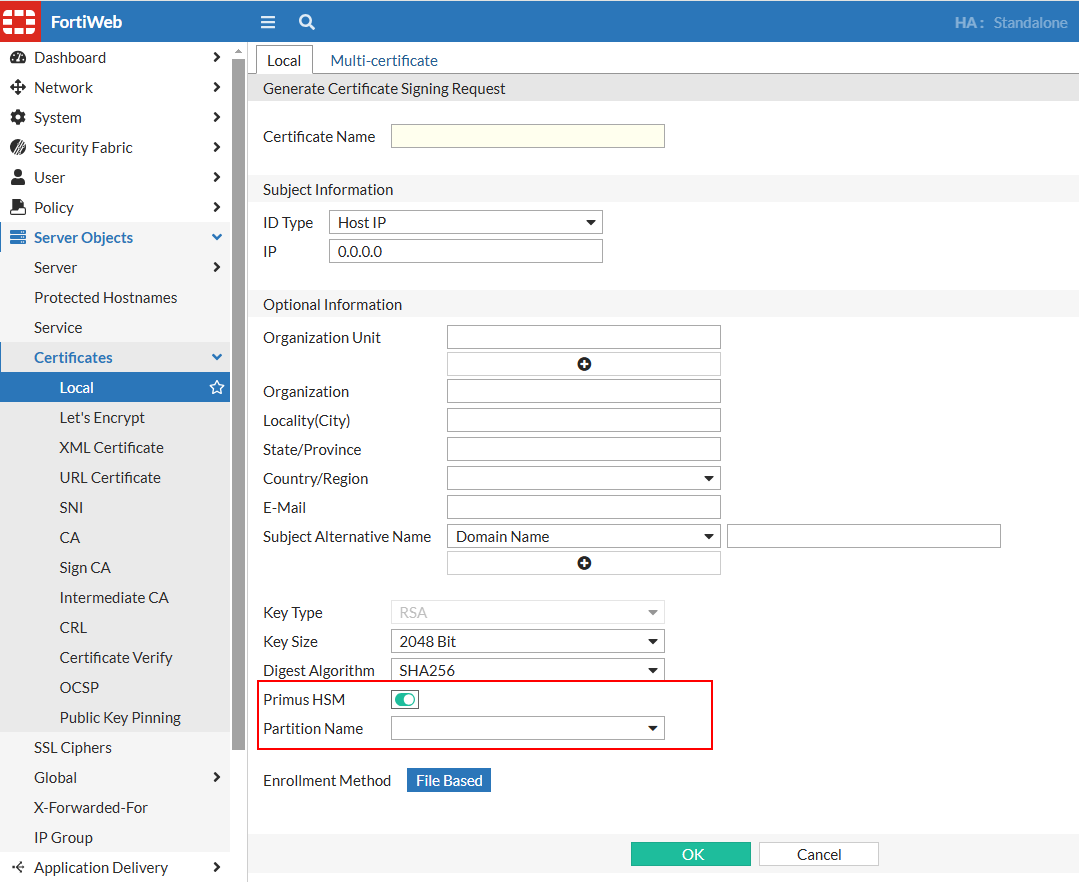 Generate a Local CSR on FortiWeb — Create a CSR on FortiWeb with the Primus HSM enabled, selecting the appropriate HSM partition.