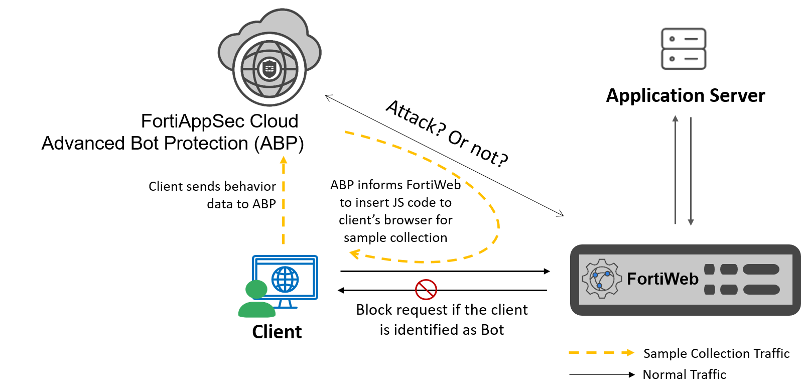 FortiWeb has integrated the FortiAppSec Cloud’s Advanced Bot Protection (ABP) service. It is a Fortinet SaaS advanced bot mitigation solution designed to detect and protect against sophisticated bots. To detect bot activity, the ABP service injects a lightweight JavaScript into the client’s browser. This script collects behavioral data and request samples, which are then used to train a machine learning model capable of identifying patterns associated with normal user interactions. All communication between FortiWeb and the ABP service is encrypted using TLS. To ensure authenticity and integrity, both FortiWeb and ABP present certificates to establish mutual TLS authentication. This safeguards the attack query process from potential interception or tampering by malicious actors. Watch the video on Advanced Bot Protection by clicking this link or accessing it via the right sidebar. |