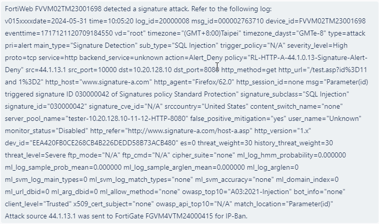 If the log that triggered the notification action contains source IP information, FortiWeb will extract the IP address and display it in the notification.