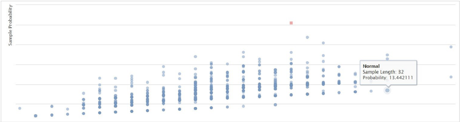 This diagram displays the anomalies in red and the legitimate requests in blue. The system judges whether a request is legitimate or not based on its probability and the length of the parameter value.