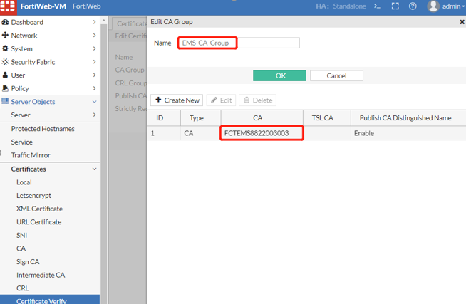 - In Server Objects > Certificates > Certificate Verify, reference the CA group in an Certificate Verify for FortiWeb to validate client certificates. For more information, see "Configuring FortiWeb to validate client certificates" in How to apply PKI client authentication (personal certificates).