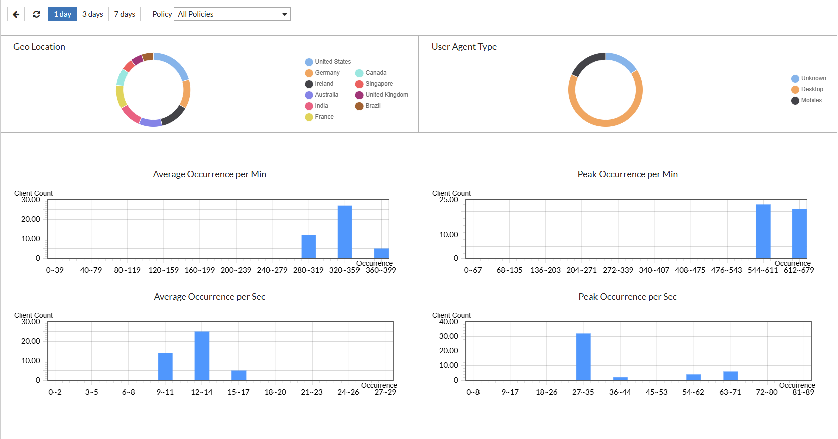 | Average Occurrence per Sec | Bar chart | Displays the total number of clients found in the range of the occurrence frequency (per second). High values may indicate scripted or automated behavior. |