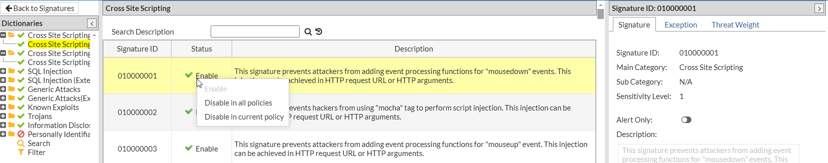Unlike Cross Site Scripting, the extended signatures are more likely to cause false positives. However, they may be necessary in specific, high-security data centers. If one of the signatures is causing false positives and you need to instead configure a custom attack signature that will not cause false positives, you can individually disable that signature. See To exclude certain signatures: