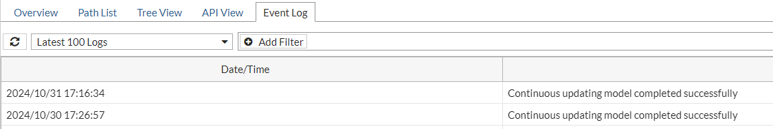 The anomaly detection events, such as sample collection, model running, building and testing, along with the time periods when these events take place. These events are also displayed in the Events tab as shown below.