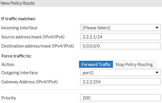 In this case, the source IPs in the outgoing package are either 2.2.2.1 or 1.1.1.1, so, instead of configuring a static route, you can alternatively configure another policy route specifying the Source address as 1.1.1.1/24, the Outgoing Interface as port1, and Gateway Address as 1.1.1.254. |