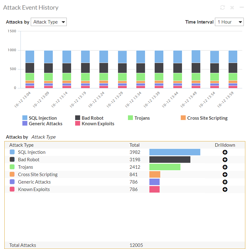 In the Attacks by Attack Type window under the graph, select the + icon under the Drilldown column to view the following information about each attack type: