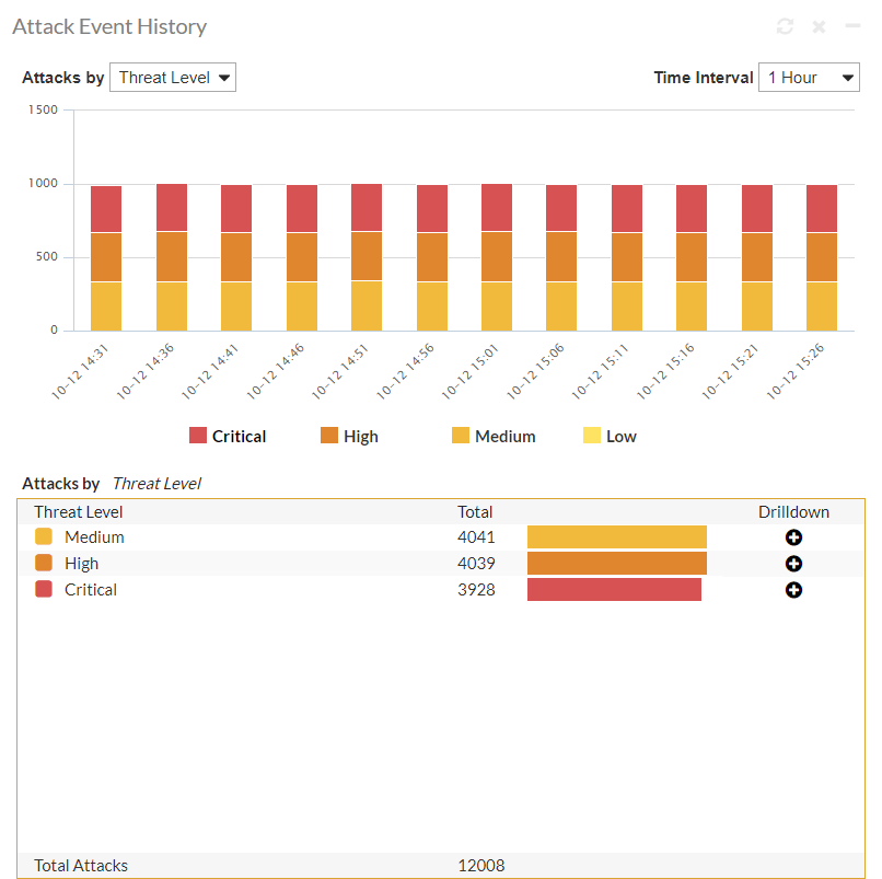 In the Attacks by Threat Level window under the graph, select the + icon under the Drilldown column to view the following information about each attack type: