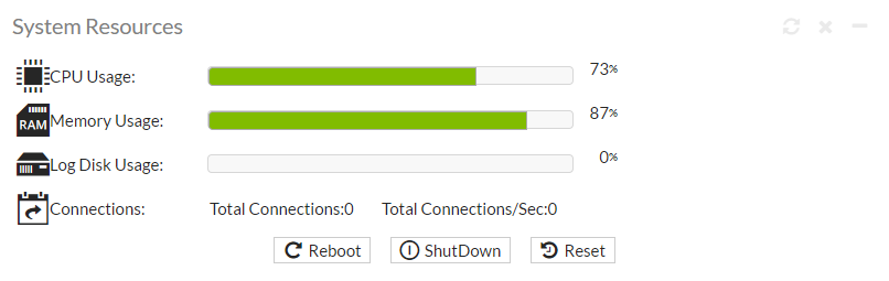 The widget displays CPU and memory usage as an animated bar and as a percentage of the usage for core processes only. CPU and memory usage for management processes (for example, for HTTPS connections to the web UI) is excluded. |
