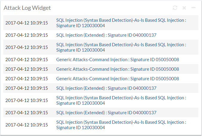 The Attack Log widget displays the latest attack logs. Attack logs are recorded when there is an attack or intrusion attempt against the web servers protected by the FortiWeb appliance.