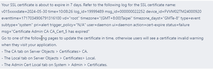 Message Type Text Message Your SSL certificate is about to expire in 7 days. Refer to the following log for more information: