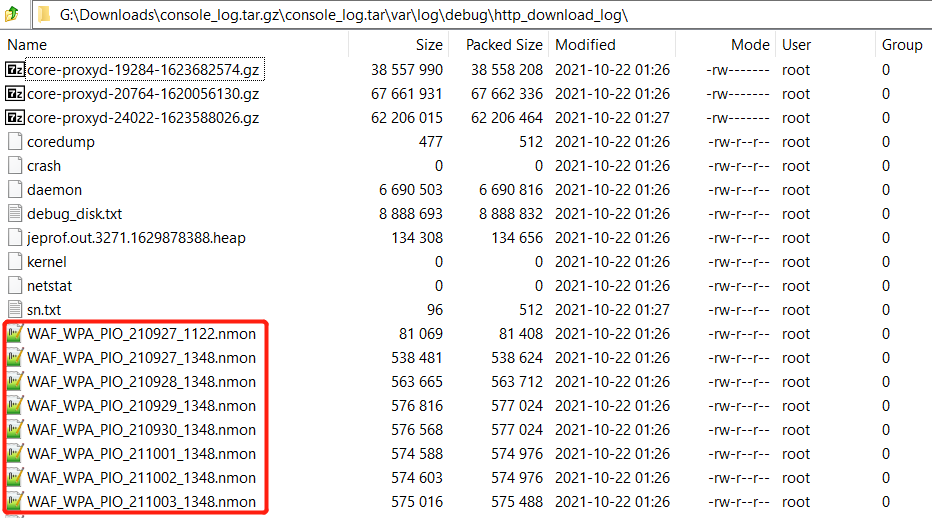 A .nmon file is generated with a sampling interval of 5 minutes, and each time when system boots up, a new .nmon file will be generated. So generally only one .nmon file named “FortiWeb_220107_1734.nmon” (may be different on some previous builds) will be generated each day. Multiple .nmon files generated in one day indicate that system rebooted or crashed.