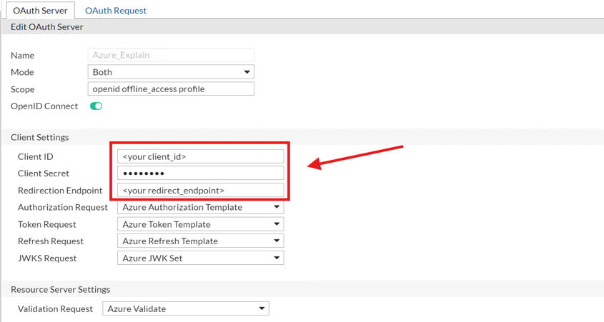 Name Enter a name for the server. Mode Select whether FortiWeb works as an authorization client or a resource server, or both. Scope Enter the scope field for OAuth. OpenID Connect