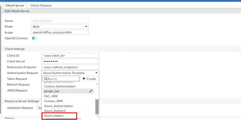- Optional. If you want to leverage OAuth authorization in combination with OIDC authentication, you will need to create a request to obtain the JWKS (JSON Web Key Set). The Request Type should be JWKS.