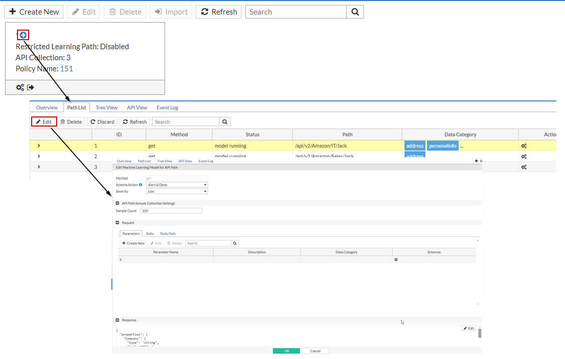 The API path data learned by the ML model is listed in the Path List tab. You can view and edit the learned data.