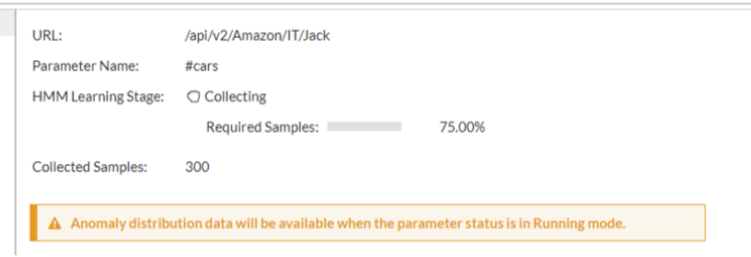 Sample Count Specify the number of samples that the system will collect for this API path. - In Parameters tab, check the parameters learned by the machine learning model. To view the parameter information, select the row of a specific path, then click