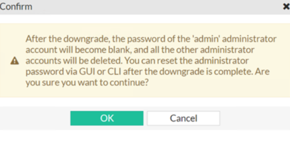 If you downgrade to versions earlier than 7.0, you need to recreate the lost accounts System > Admin > Administrators. The following message will prompt after downgrading: