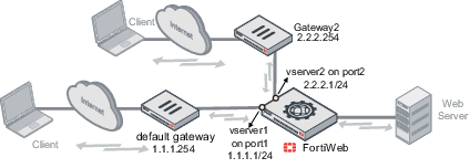 In most cases, you use policy routes in Reverse Proxy mode. In this mode, requests are destined for a virtual server’s network interface and IP address on FortiWeb, not a web server directly. When FortiWeb sends response package to the client who initiated the request, the source IP in the response package is the virtual server's IP address, not the web server's IP address. In the following paragraphs, we will introduce how to use policy route to direct the traffic to different next-hop gateways based on the source IP in the response package.