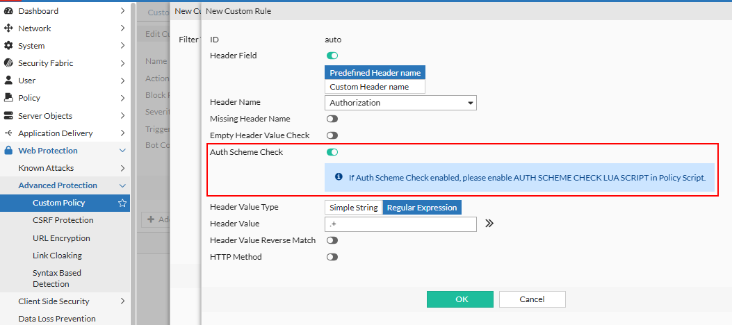 The Auth Scheme Check option is available when Predefined Header Name is set to Authorization and both Missing Header Name Check and Empty Header Value Check are disabled. When this option is selected, FortiWeb expects authentication scheme validation to be handled by an associated Lua script configured in the policy.