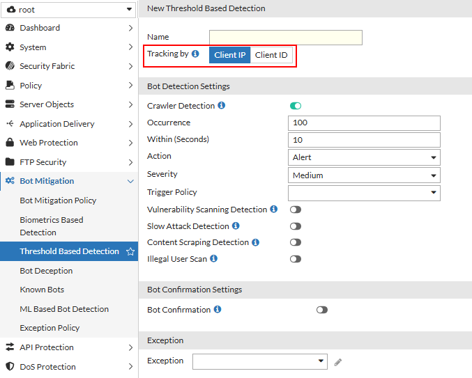 A new Tracking by option is now available in both the GUI and CLI, allowing administrators to choose between Client IP and Client ID tracking. The selection applies globally across all supported detection modules except Slow Header Attack, which automatically defaults to IP-based tracking due to technical limitations. For details, see Slow Header Attack Detection (8.0.0).