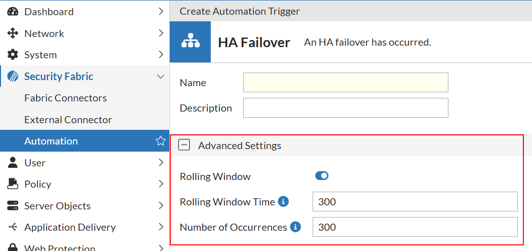 A new Advanced Settings section is added to Security Fabric > Automation > Triggers.