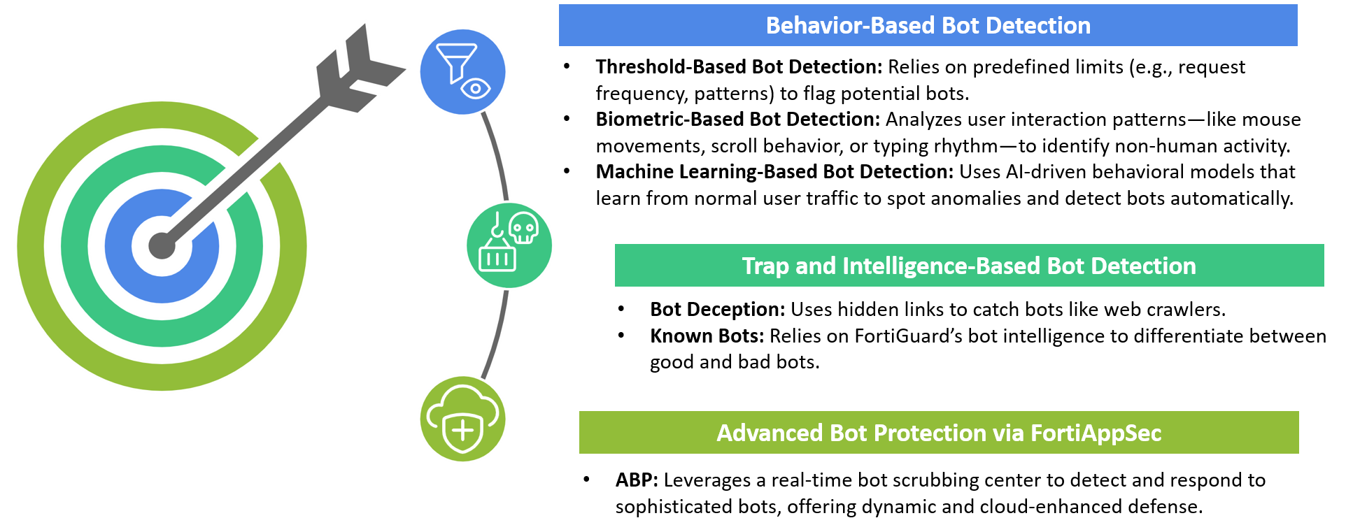 FortiWeb’s Threshold-Based Bot Detection is a feature that helps distinguish between human users and automated bots by monitoring for suspicious behaviors that occur at abnormal rates, such as the frequency of 403 and 404 response codes, attack signatures, slow attack activities, content scraping activities, and illegal user scan. Watch the video on Threshold-Based Bot Detection by clicking this link or accessing it via the right sidebar. |