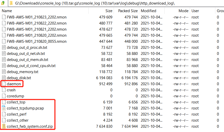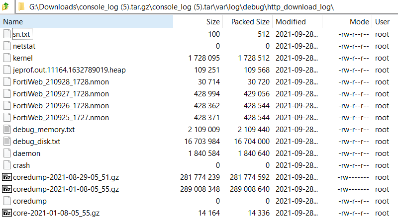 FortiWeb GUI provides an easier way to collect such debug logs. Most logs under /var/log/debug/ and /var/log/gui_upload will be archived after you click the “Download” button on System > Maintenance > Debug > Download section.