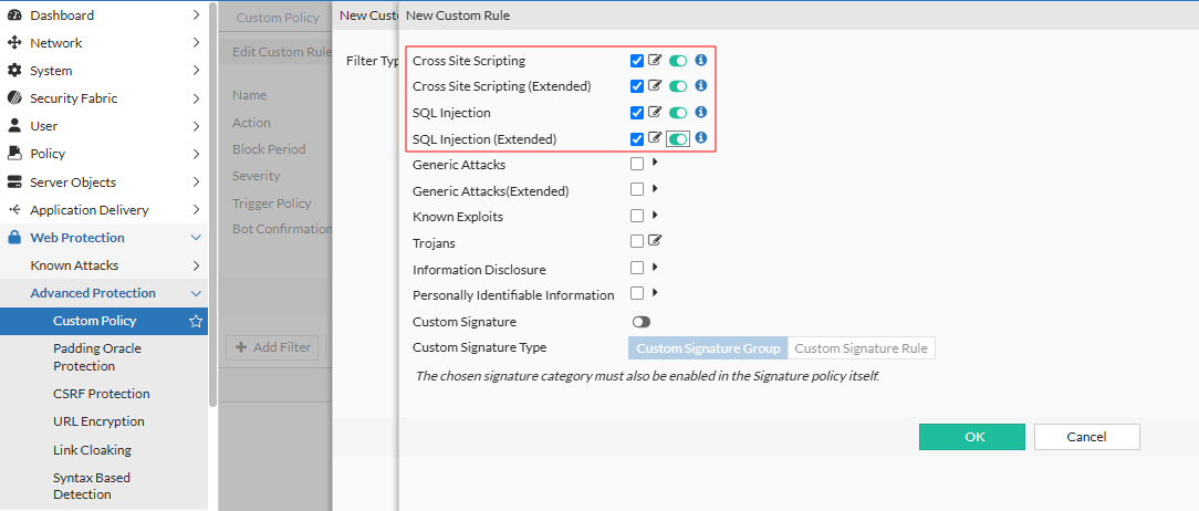 FortiWeb 8.0.0 enhances the Custom Rule filter mechanism by integrating Syntax-Based Detection (SBD) into the Signature Violation filter type. This improvement introduces an optional secondary check to reduce false positives by verifying whether traffic that matches a Signature-Based Detection (SD) pattern also exhibits known malicious syntax characteristics.