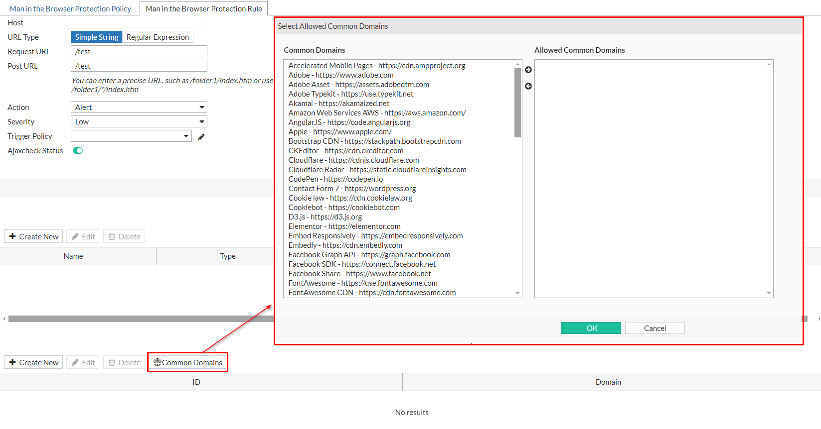 - You can also click Common Domains to choose from a list of well-known third-party external resources which would be used through AJAX request. To allow the domains, select them from the left-side list then click the arrow to move them to the right-side.