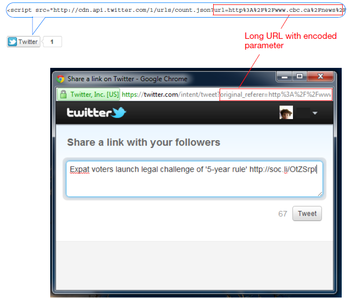 For example, social media buttons for Twitter append an encoded version of your web page’s URL as long parameters named original_referer and url after the request URL to twitter.com.