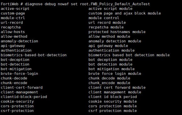 diagnose debug nowaf set <adom name>.< policy name> <module name1> <module name2> … <module nameN>