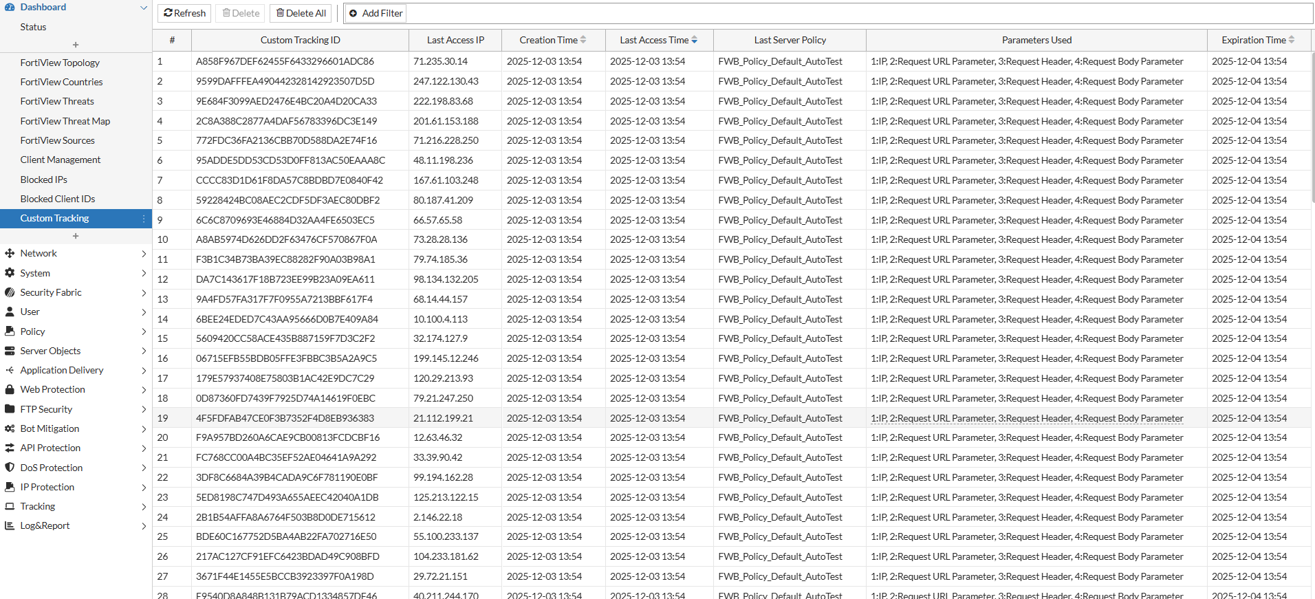 The Custom Tracking monitor provides real-time visibility into all active custom tracking IDs. The monitor shows how each ID was formed, how long it has been active, and how it is being used across traffic flows. This helps administrators understand traffic patterns, validate policy behavior, and troubleshoot how identifiers appear in requests and responses.