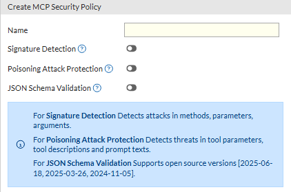 Name Enter a unique name for the policy that can be referenced by other parts of the configuration. Signature Detection Enable to prevent attacks on the MCP server, such as injection or command execution. FortiWeb evaluates MCP fields including methods, tool names, and argument values for indicators of unsafe behavior. Poisoning Attack Protection Enable to prevent adversarial attempts to manipulate LLM behavior or steal sensitive information. This scans tool descriptions, tool parameters, and prompt content. JSON Schema Validation Enable to ensure each streamed MCP message meets the official specification provided by FortiGuard based on the MCP version. -