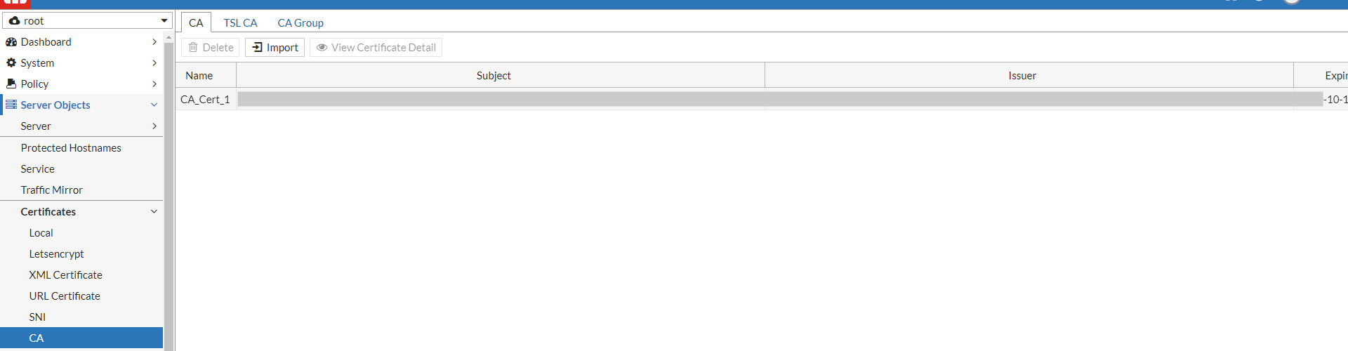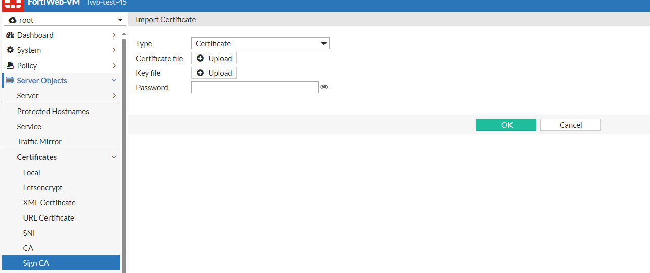 - Upload the CA certificate to Server Objects > Certificates > Sign CA.