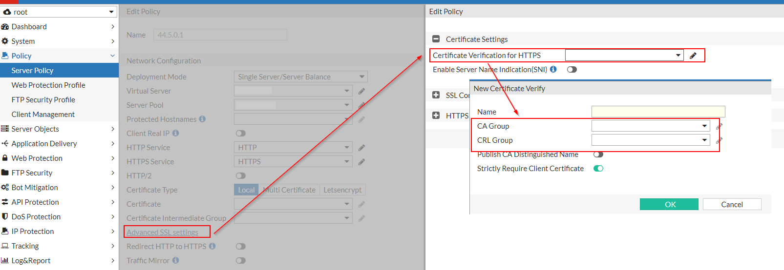 The CA certificate used for client certificate verification should be uploaded through Server Objects > Certificates > CA.