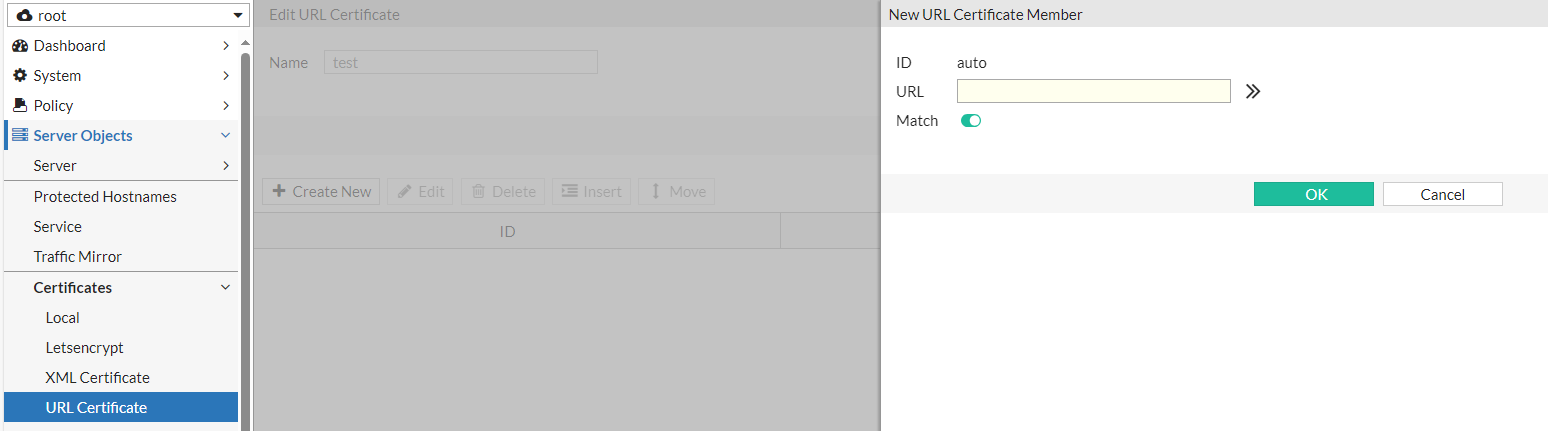 - In Server Objects > Certificates > URL Certificate, specify the URLs for which you would like to implement client certificate verification.