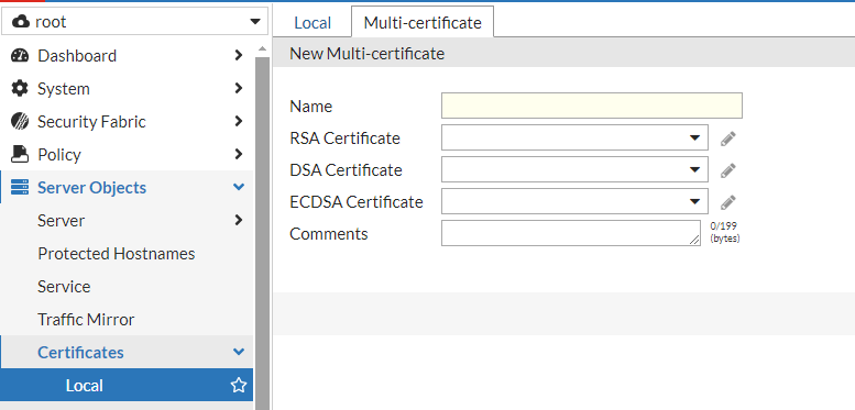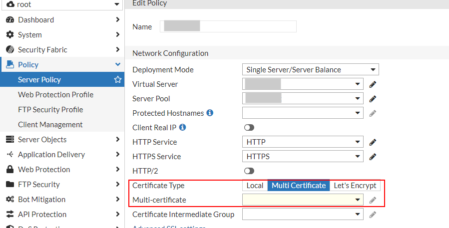 The cryptographic algorithm used to encrypt HTTPS connections is negotiated between the client and FortiWeb during the SSL handshake process. The connection will fail if the cryptographic algorithms supported by the client are not compatible with those supported by the SSL certificates presented by FortiWeb. To provide broader compatibility across different clients and devices, you can configure RSA, DSA, and ECDSA certificates into one "Multi-certificate" and reference it in the Server Policy.