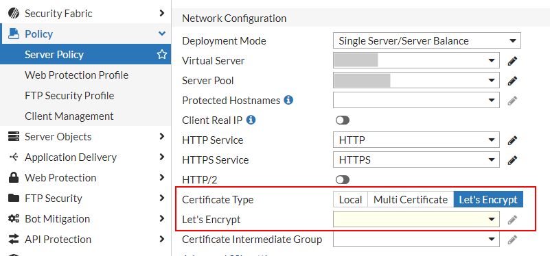 Let's Encrypt certificate is configured through Sever Objects > Certificates > Let's Encrypt, then is referenced in Server Policy.