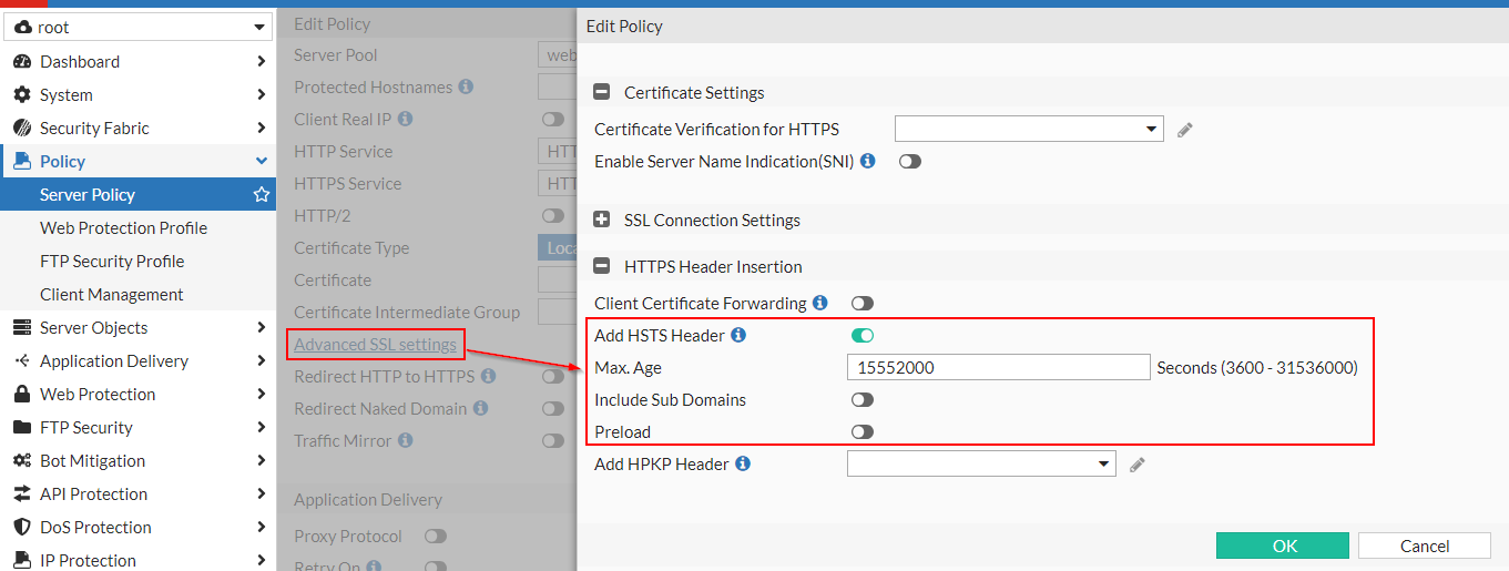 Initial HTTPS Connection: When a user first connects to your application via HTTPS, FortiWeb sends an HSTS header to the browser.