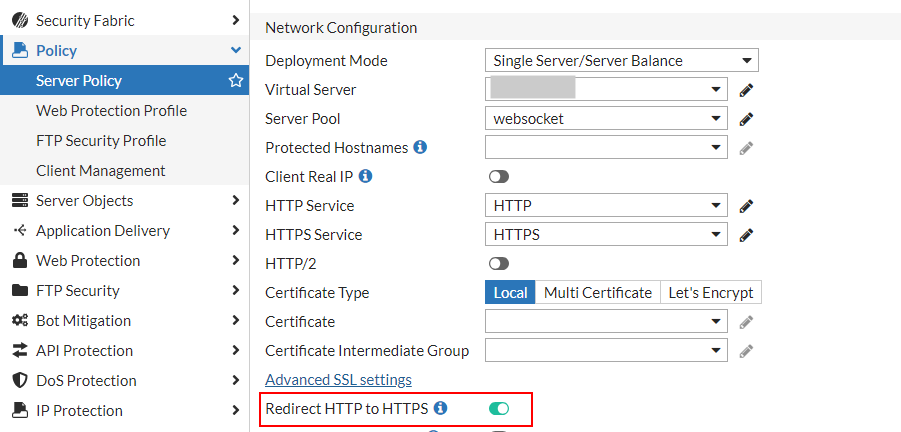 Enabling HTTPS redirection in FortiWeb is just one click. In Server Policy, if you have selected both HTTP and HTTP services, the "Redirect HTTP to HTTPS" option will appear.