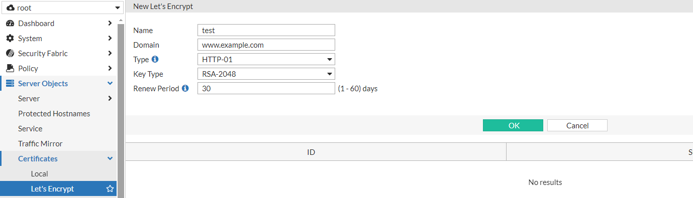 If you don't have a physical CA-issued certificate to upload to FortiWeb, you can use the Let's Encrypt certificate as an alternative. Let's Encrypt is a non-profit certificate authority run by the Internet Security Research Group (ISRG), providing X.509 certificates for Transport Layer Security (TLS) encryption at no charge. A Let's Encrypt certificate functions the same as a CA-issued certificate, with simpler configuration. Simply enter your domain name, and FortiWeb will obtain a certificate from Let's Encrypt on your behalf.