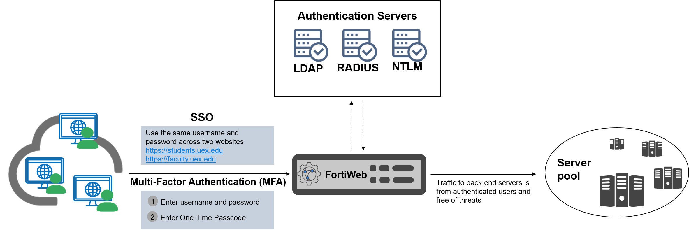 Use their Web Application Firewall (WAF) (e.g., FortiWeb) to seamlessly integrate with the authentication server to protect their applications and facilitate secure access.